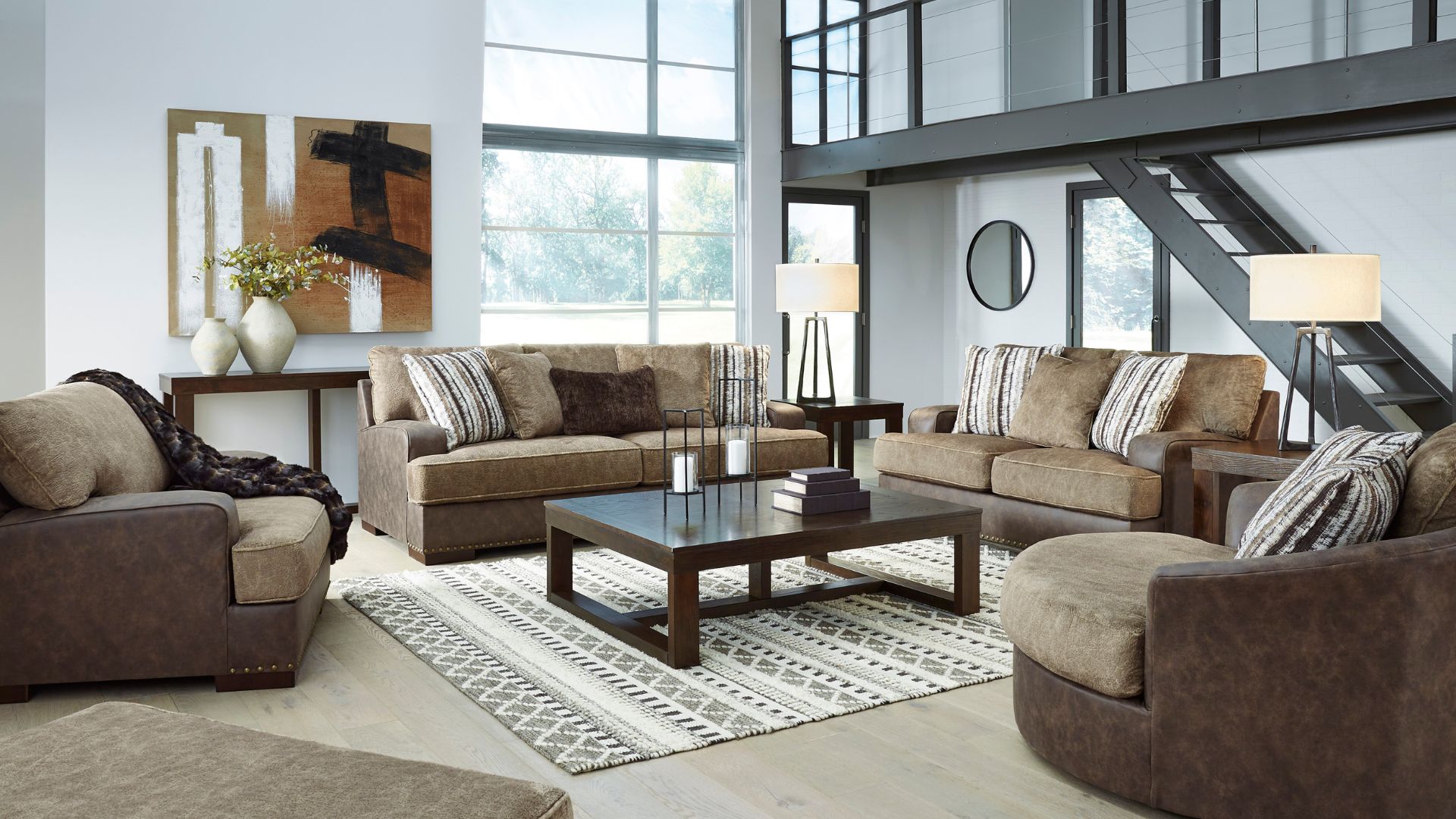 Punctuated by a subtle band of nailhead trim, the Alesbury sofa is perfect for those who love the look of leather. Two textural tones provide twice the style and comfort—and incorporate an added layer of visual interest. Throw pillows add a fun decorative element.