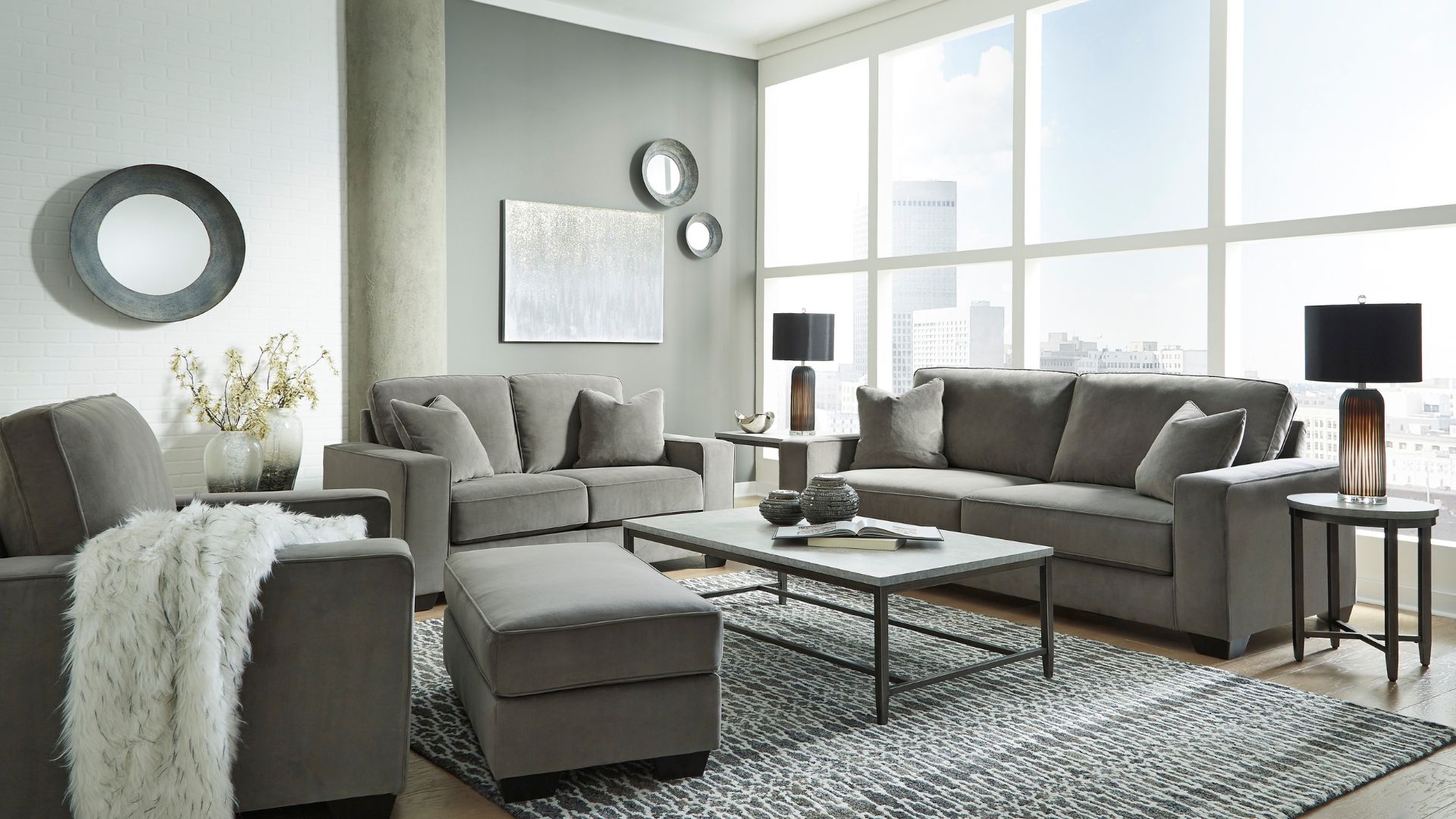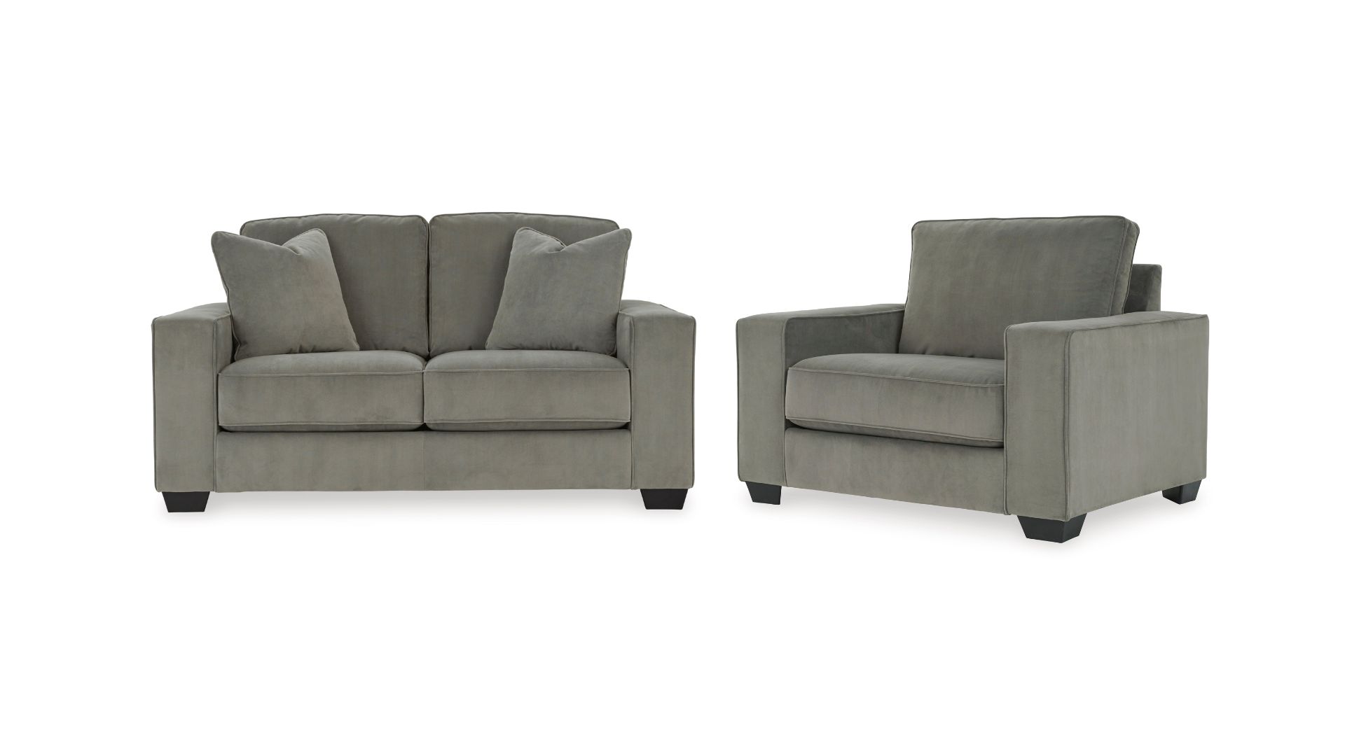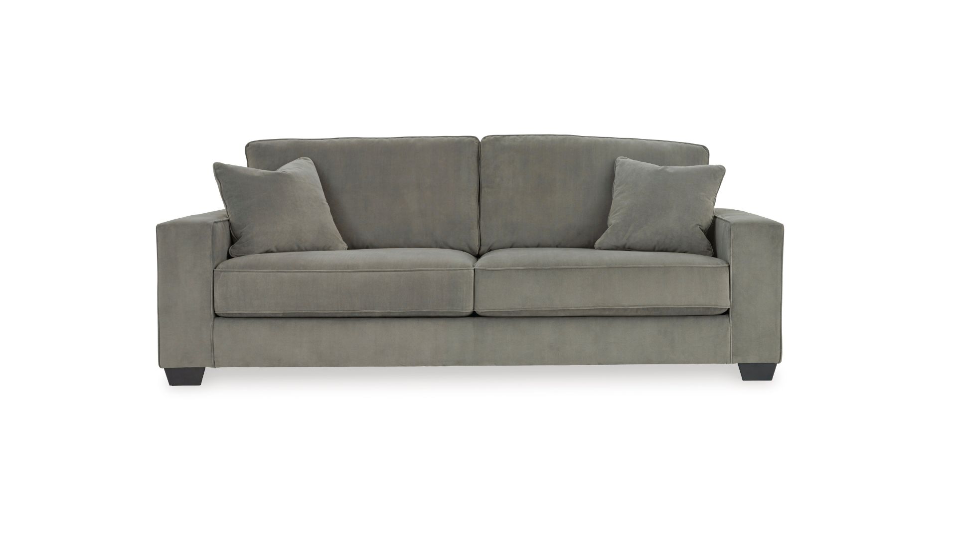 Serving up a refined, upscale look—at an incomparable value price—the Angleton sofa lures from every angle. Crisp, 2-over-2 cushion design, wide track arms and black tapered feet lend a clean, contemporary aesthetic. Velvety soft upholstery in a chic sandstone gray upholstery takes neutral to another level. Matching feather-filled throw pillows master the art of minimalism.
