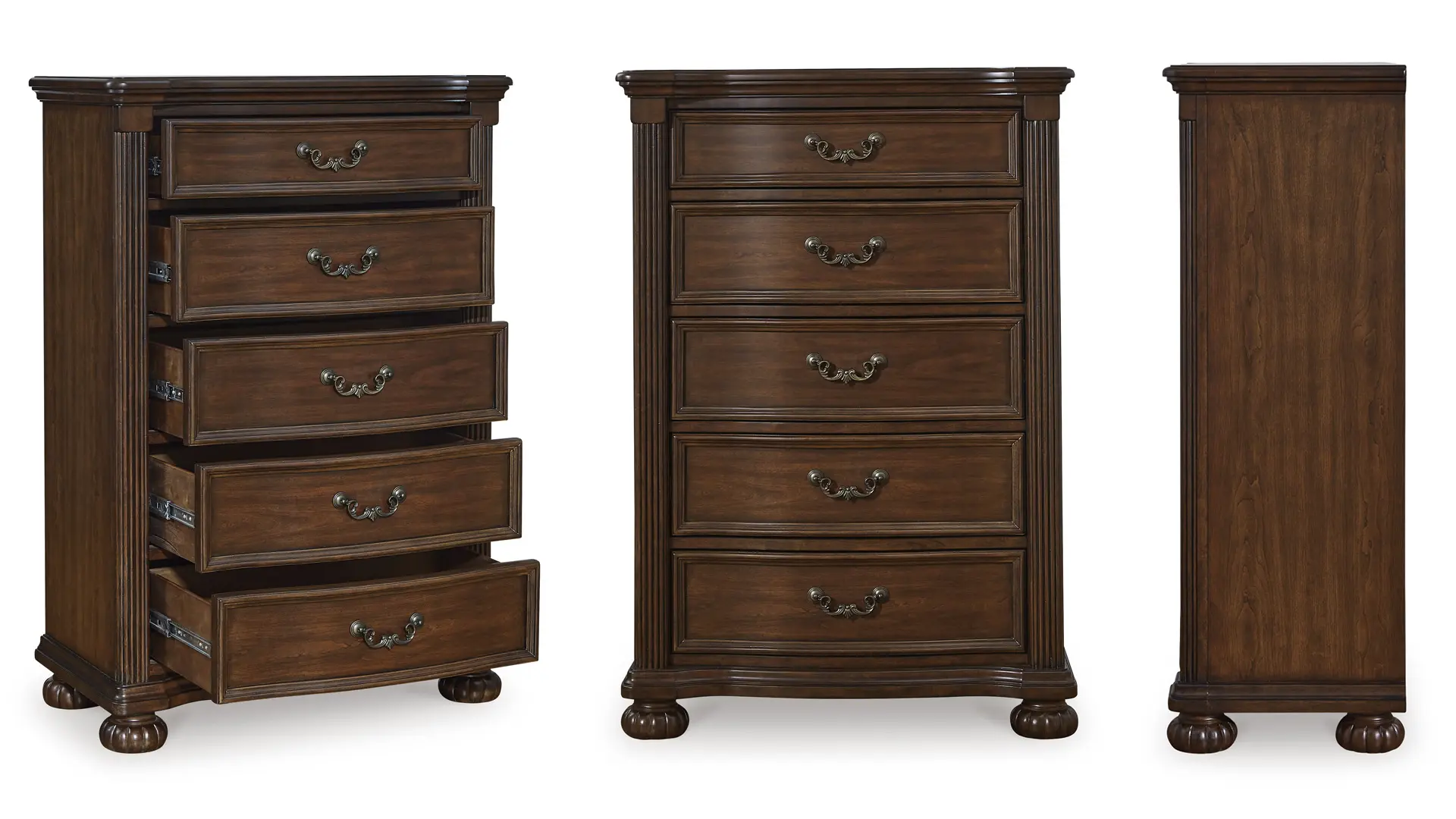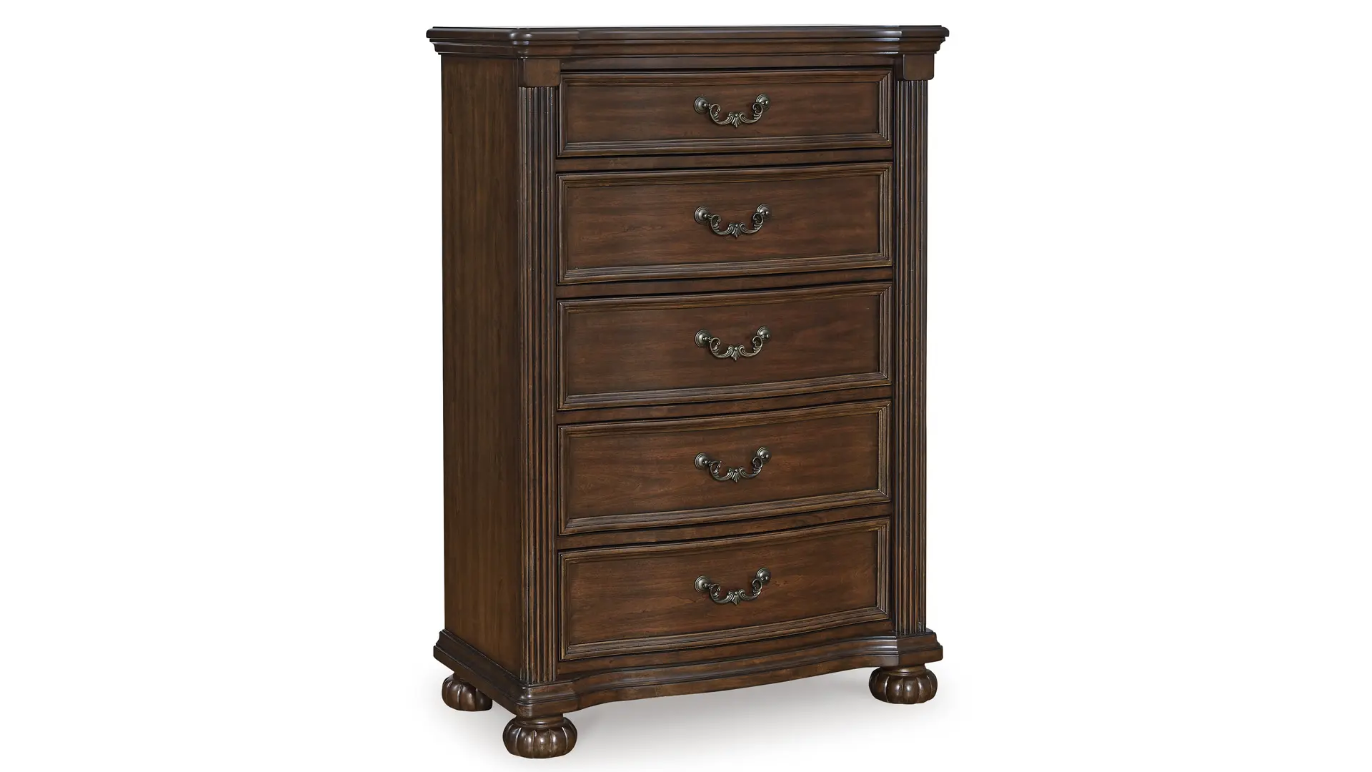 Elevate your bedroom with the timeless elegance of the Lavinton chest of drawers. Featuring a rich cherry brown finish, this beautifully designed piece exudes sophistication. Ornate drawer pulls and classic bun feet add a refined touch, while five spacious drawers provide ample storage for clothing and essentials.