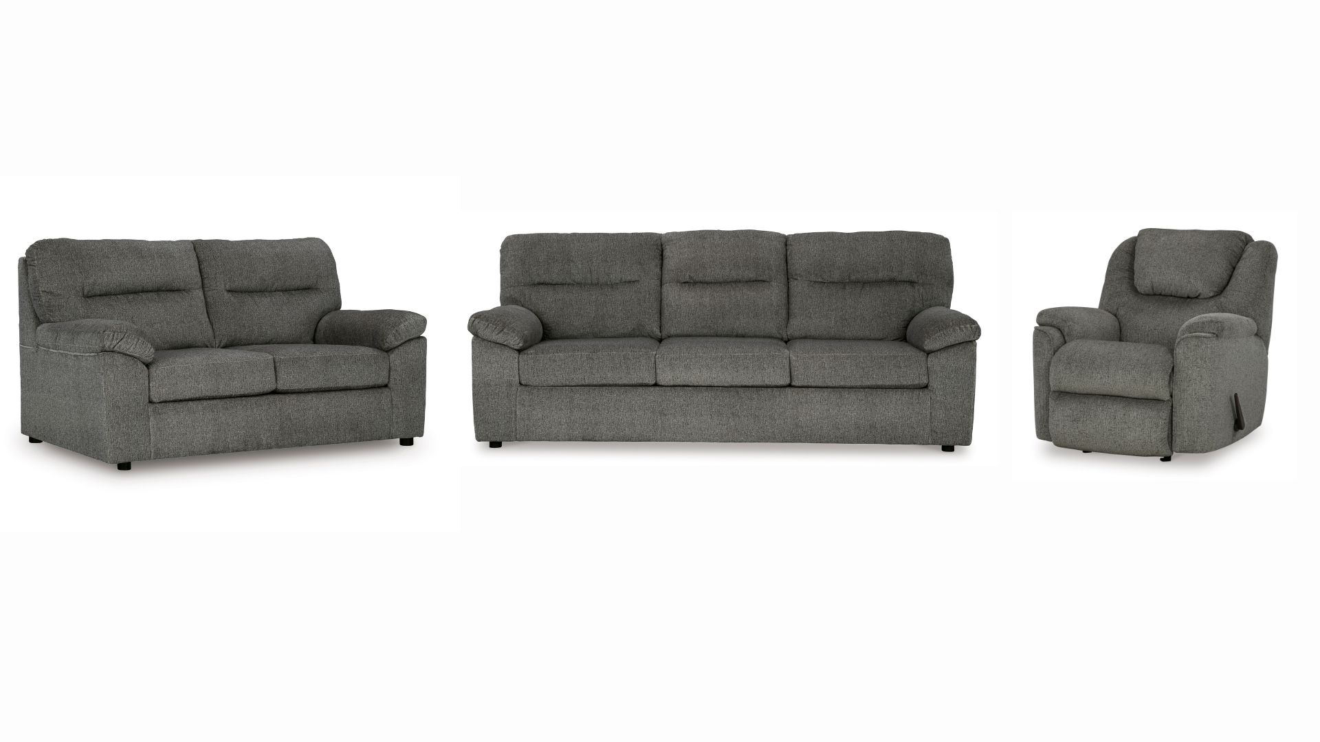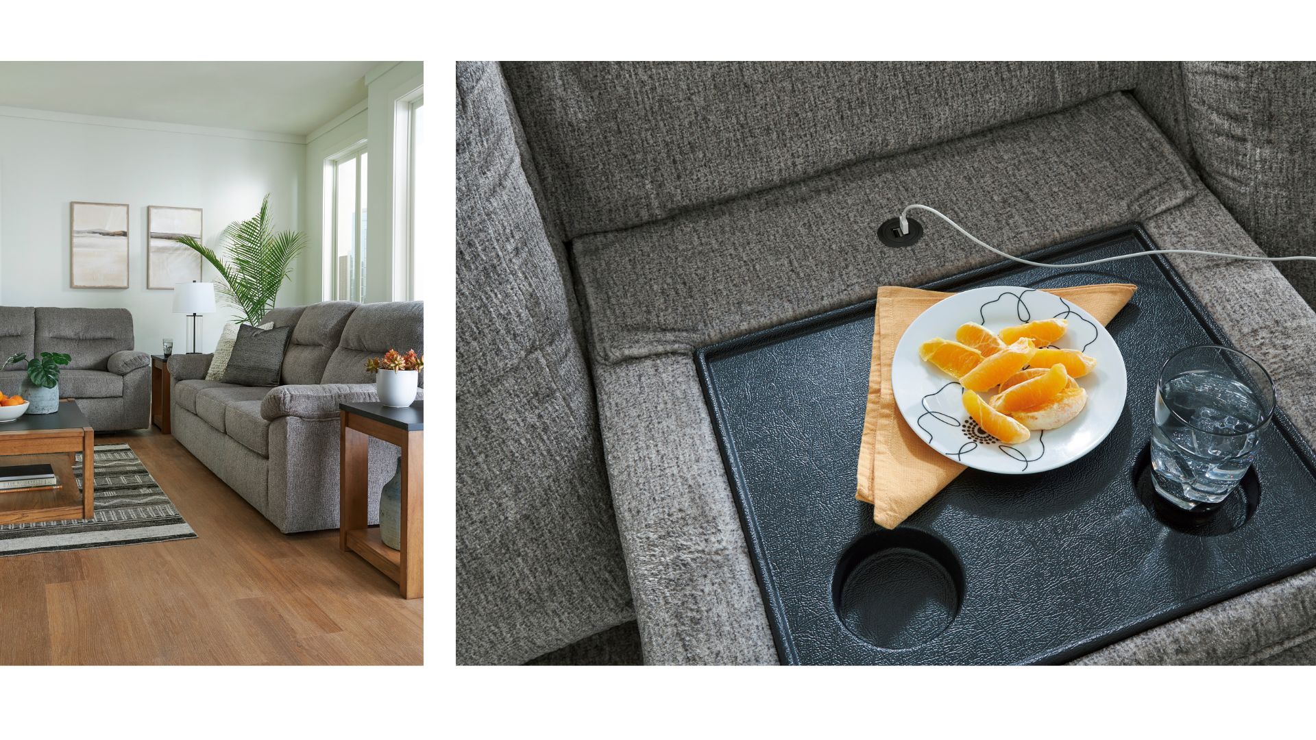 Make your living room the ultimate hangout with this upholstery package. Its buttery soft upholstery encourages you to lounge a while longer. And when it’s time to hit a peak state of relaxation, integrated cup holders and USB charging in the drop-down table keep all your essentials on hand. Comfortable, casual and contemporary, this set caters to the style you love and the function you crave.