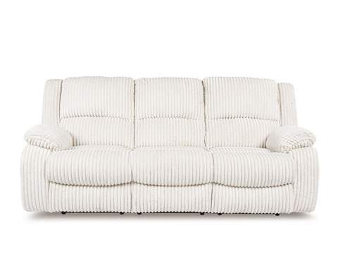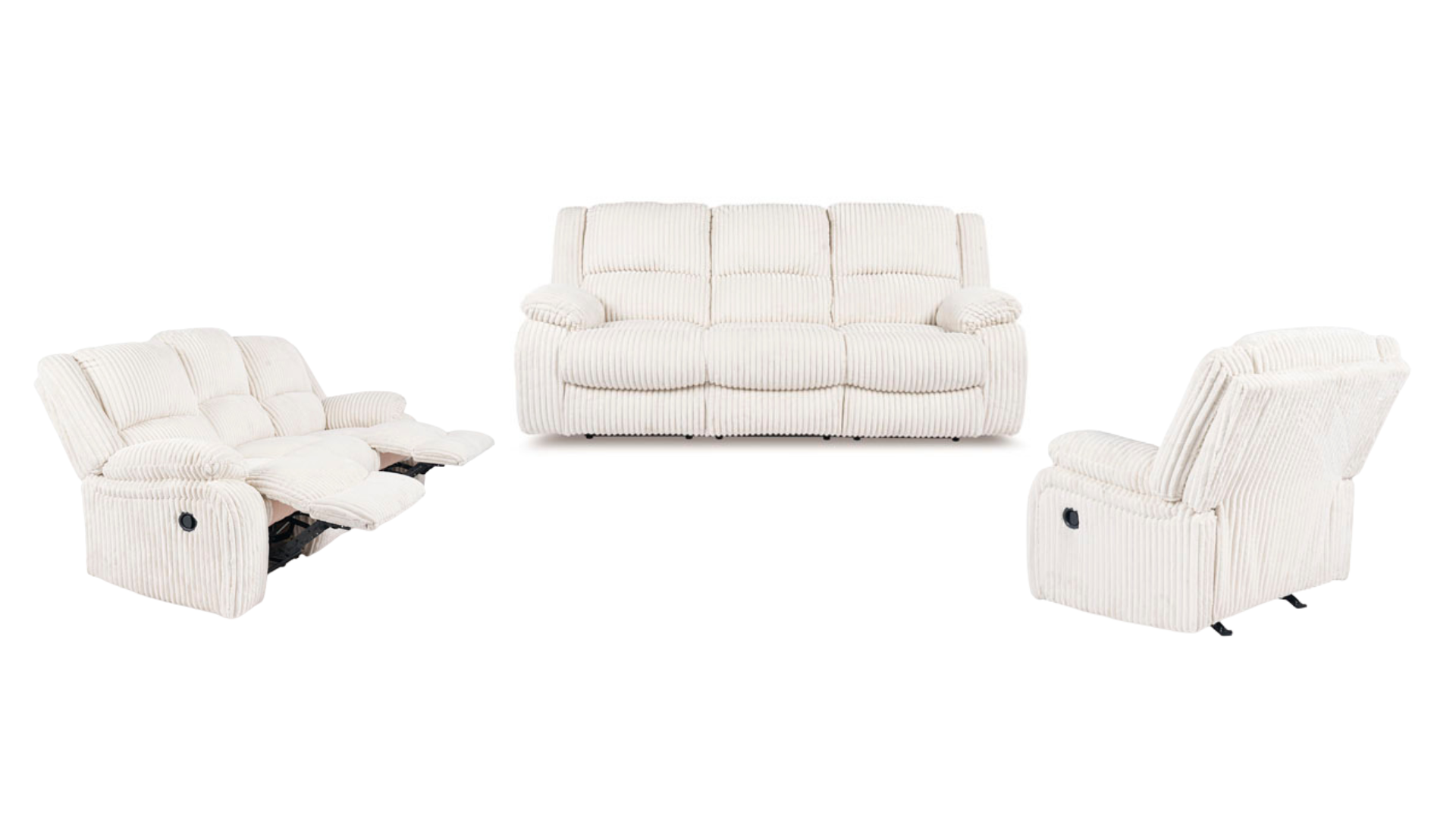 This Bonnacraft Reclining 6 Seater Sofa in soft cord-style fabric combines comfort and functionality with a refined aesthetic. Upholstered in a neutral tone, it features dual recliners and a convenient centre console, ideal for keeping essentials within reach.