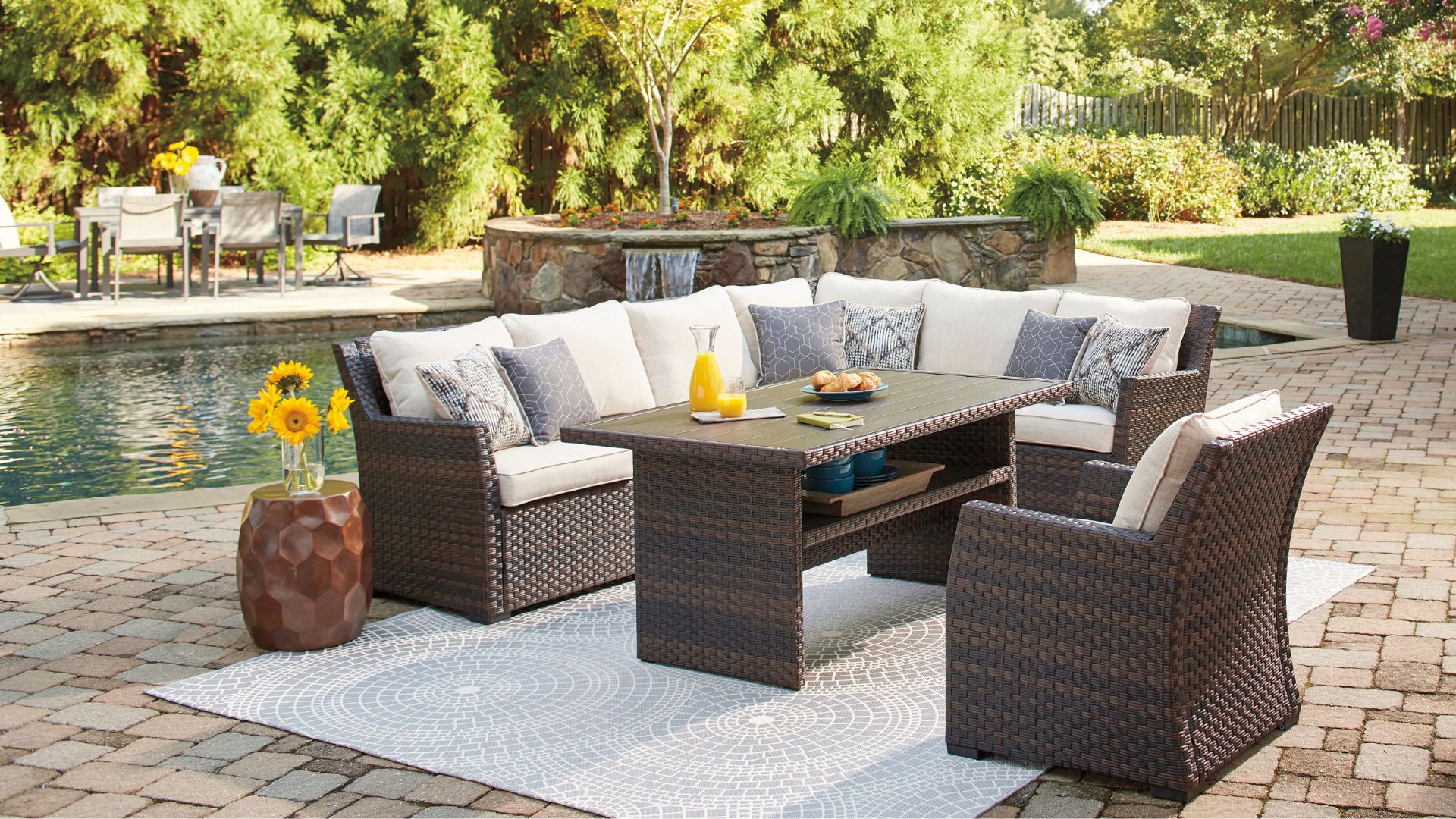 The Easy Isle outdoor furniture set is easy to love. Resin wicker over a rust-free aluminum frame lends an upscale aesthetic that’s downright durable. Wrapped in high-performing Nuvella® fabric, the plush, neutral-tone cushions and throw pillows are comfortable and carefree.