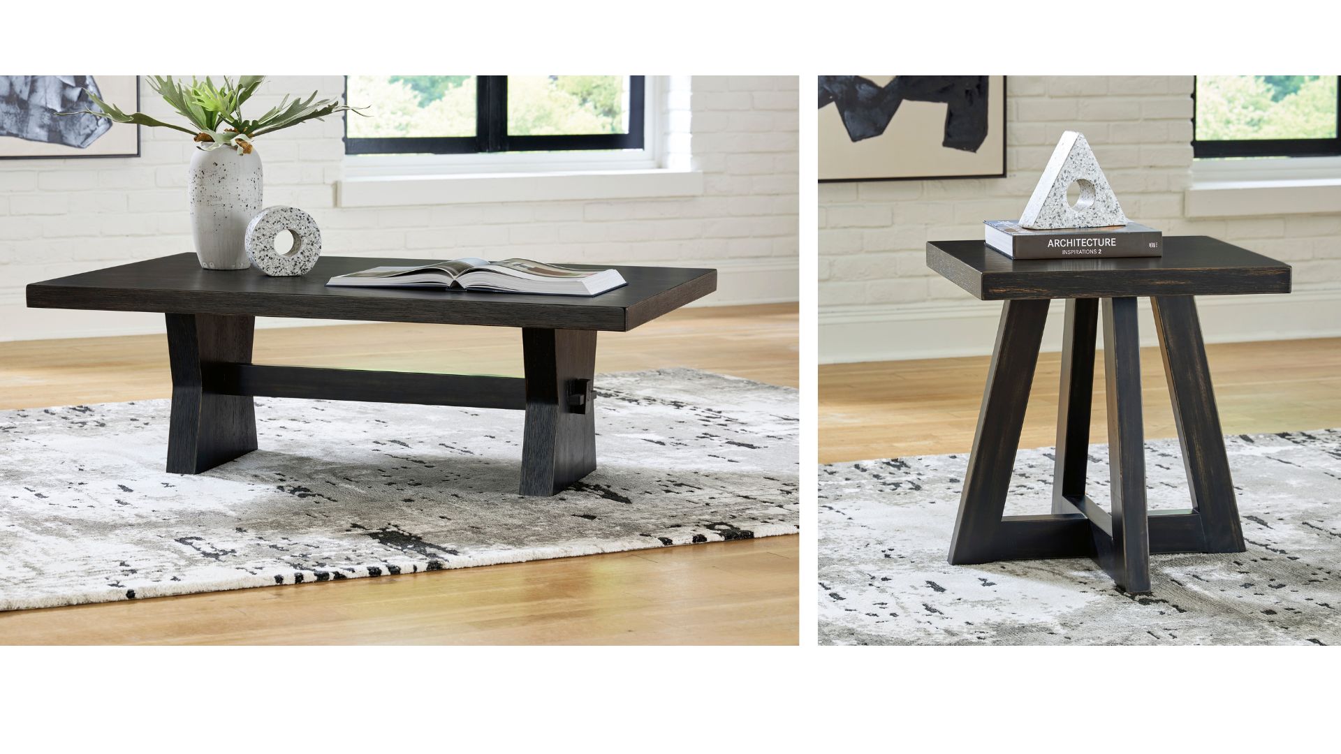 The Galliden cocktail table brings a rustic vibe to urban contemporary design. It’s a modern approach to natural beauty, with an aged black finish defining a unique geometric design.