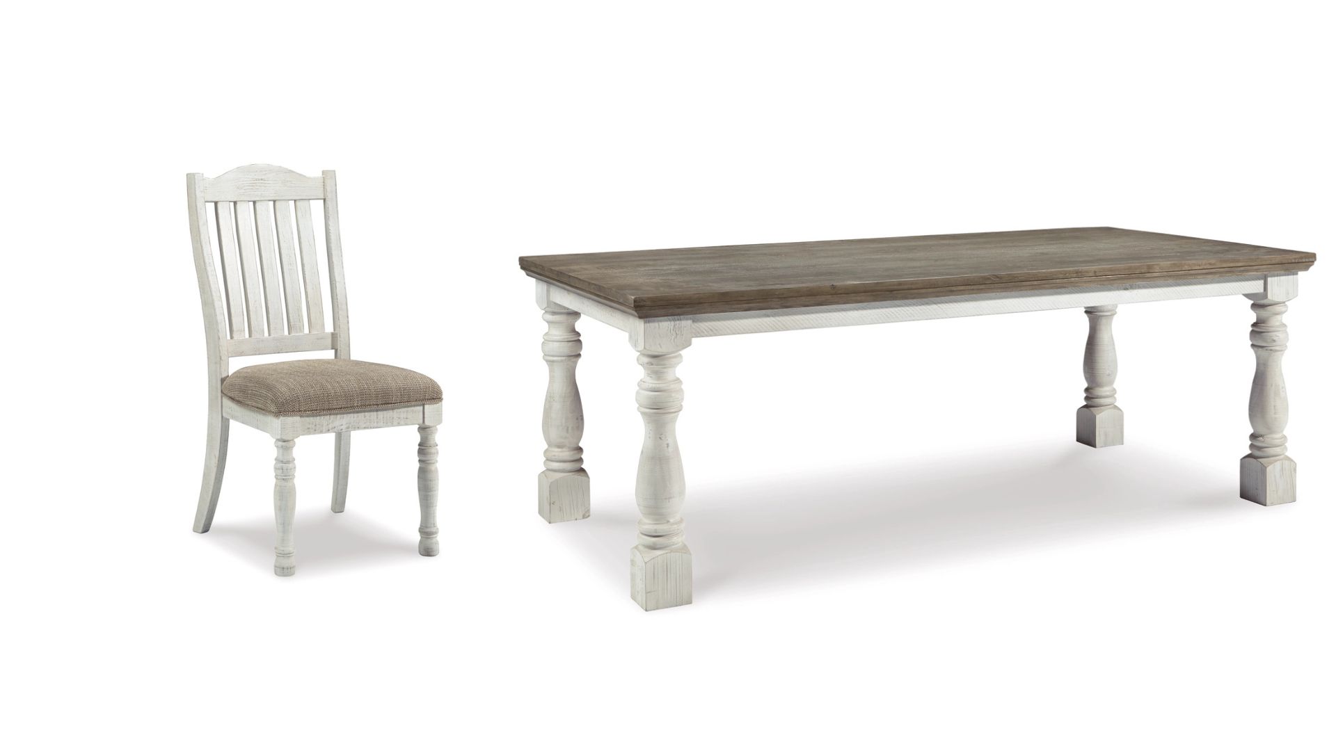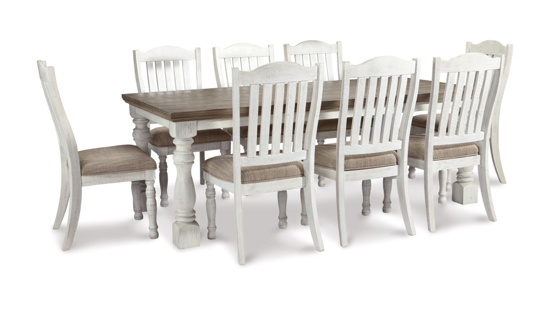 Have your fill of modern farmhouse style with the Havalance 9-piece dining set. Distressed, vintage-style finishes blend weathered neutrals for an utterly charming effect. The table boasts robust legs for a hearty, substantial look while the bent slat back design and cushioned upholstered seat of the dining chairs cater to your aesthetic.
