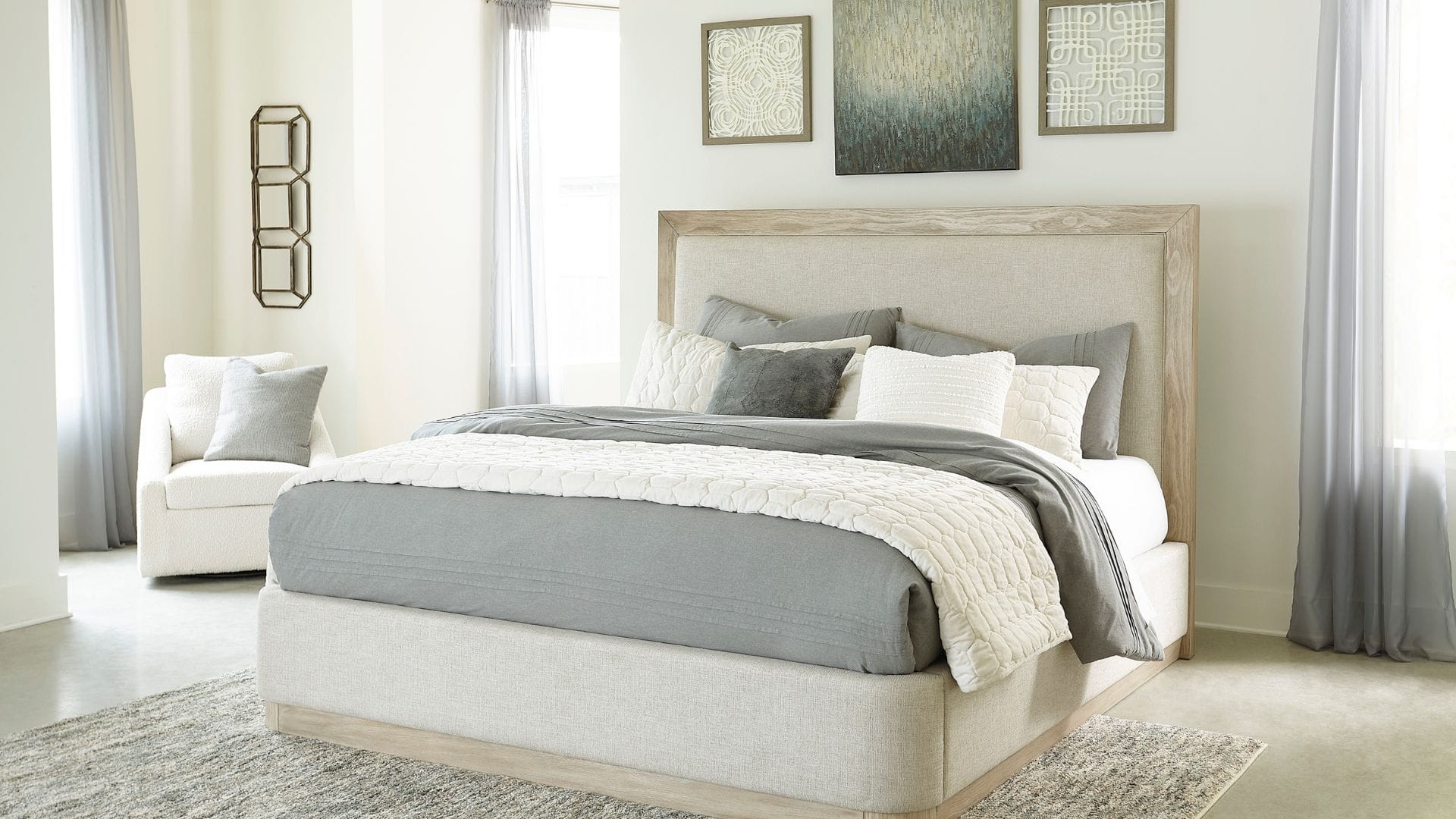 Get the luxe modern contemporary design you love at an affordable price. The Hennington king upholstered panel bed features a structured silhouette on a plinth base that elevates the piece to a modern masterpiece. Soft yet still sleek in design, this bed’s side rails and footboard are cushioned and have rounded ends. The textural surface of the bisque-colored wood pairs beautifully with the neutral upholstery.