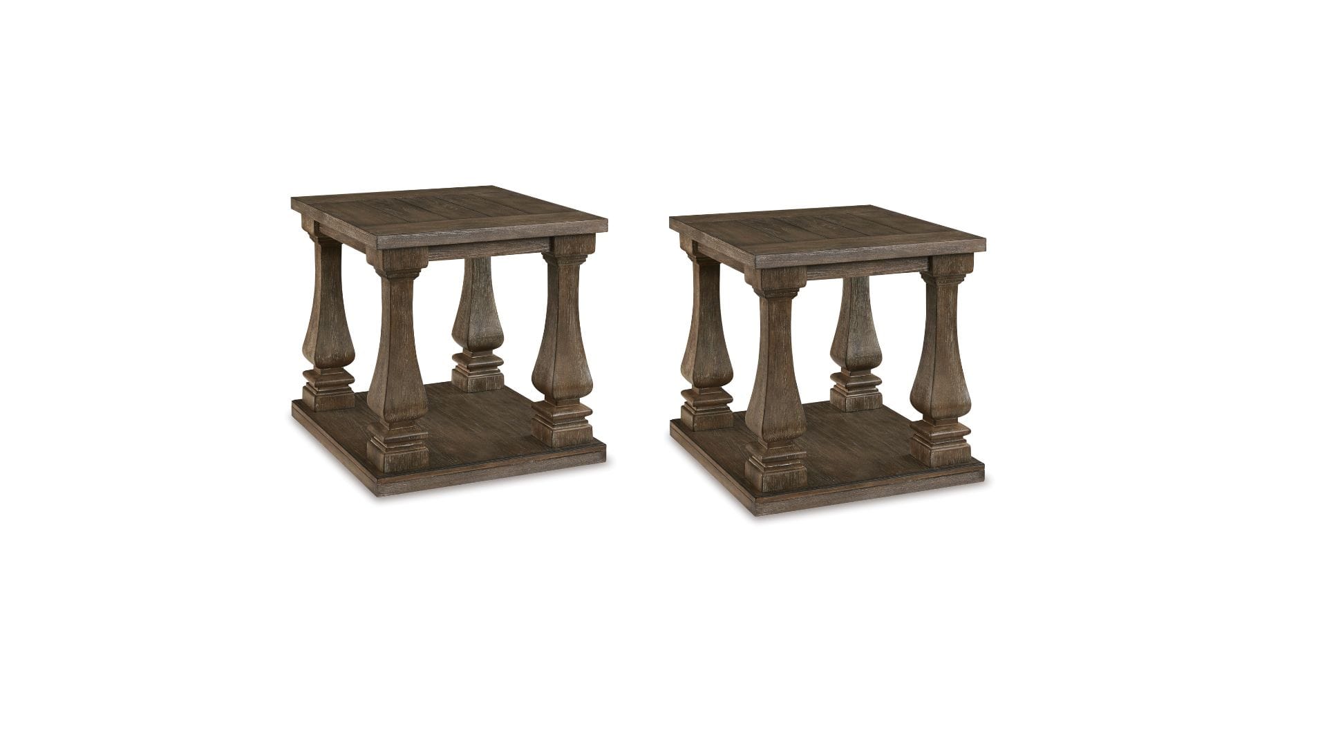 Homey. Hearty. Heavenly hued. Luring with a distressed weathered gray finish and square baluster legs set on a broad lower shelf for great presence, the Johnelle occasional table set is sure to make your homestead feel that much more like home. The look is beautified with elm veneers and a framed and plank-effect tabletop for a richly crafted masterpiece made for years of satisfaction.