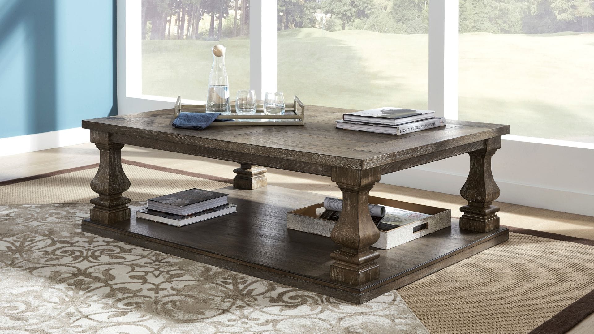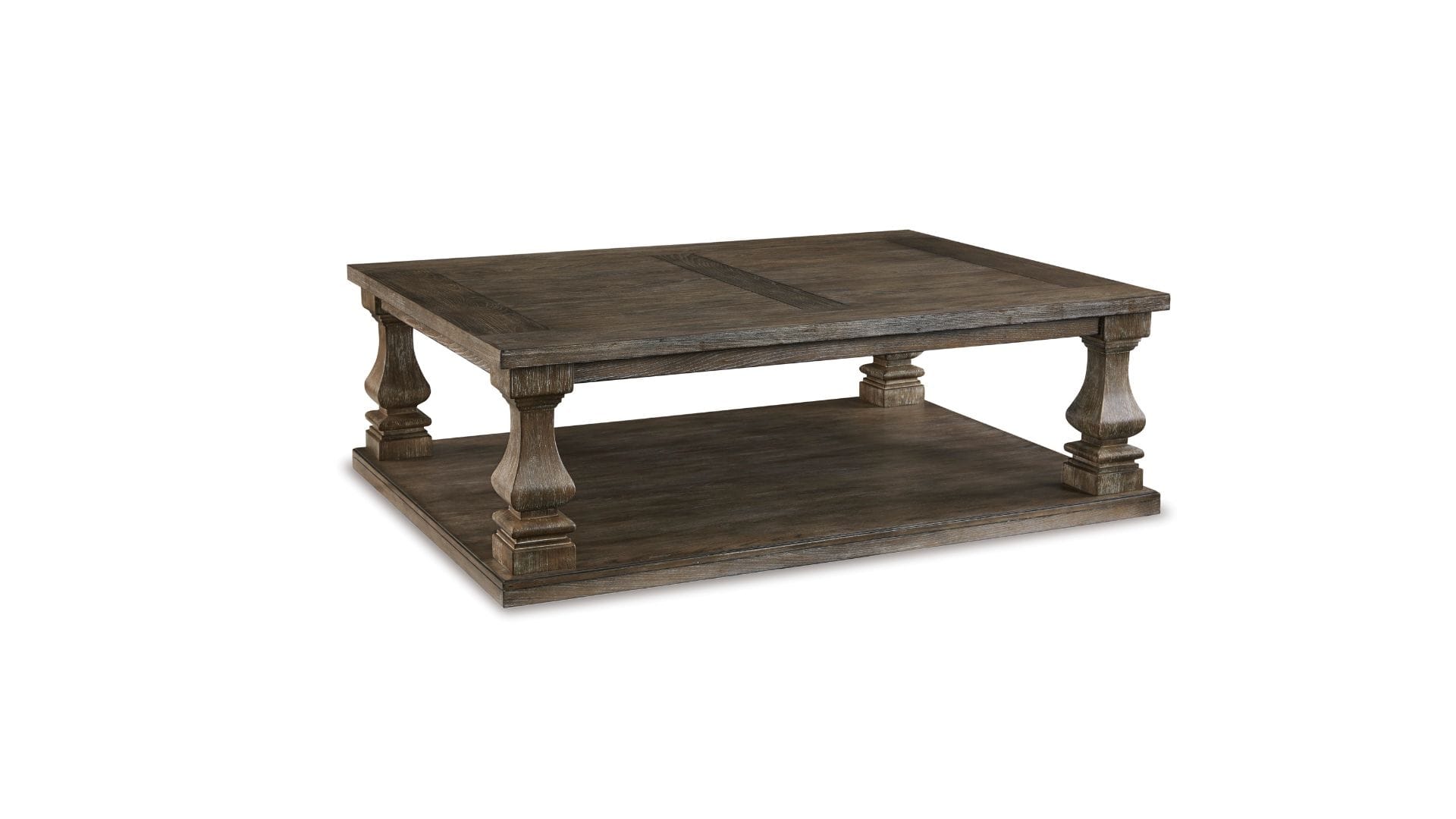 Homey. Hearty. Heavenly hued. Luring with a distressed weathered gray finish and square baluster legs set on a broad lower shelf for great presence, the Johnelle occasional table set is sure to make your homestead feel that much more like home.