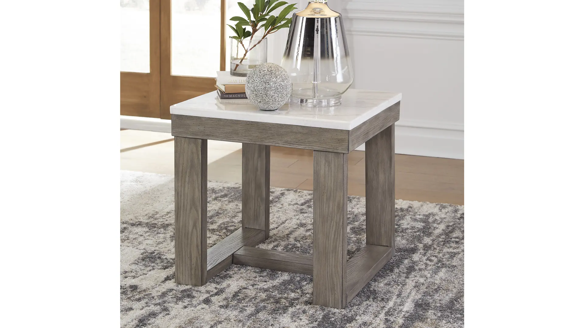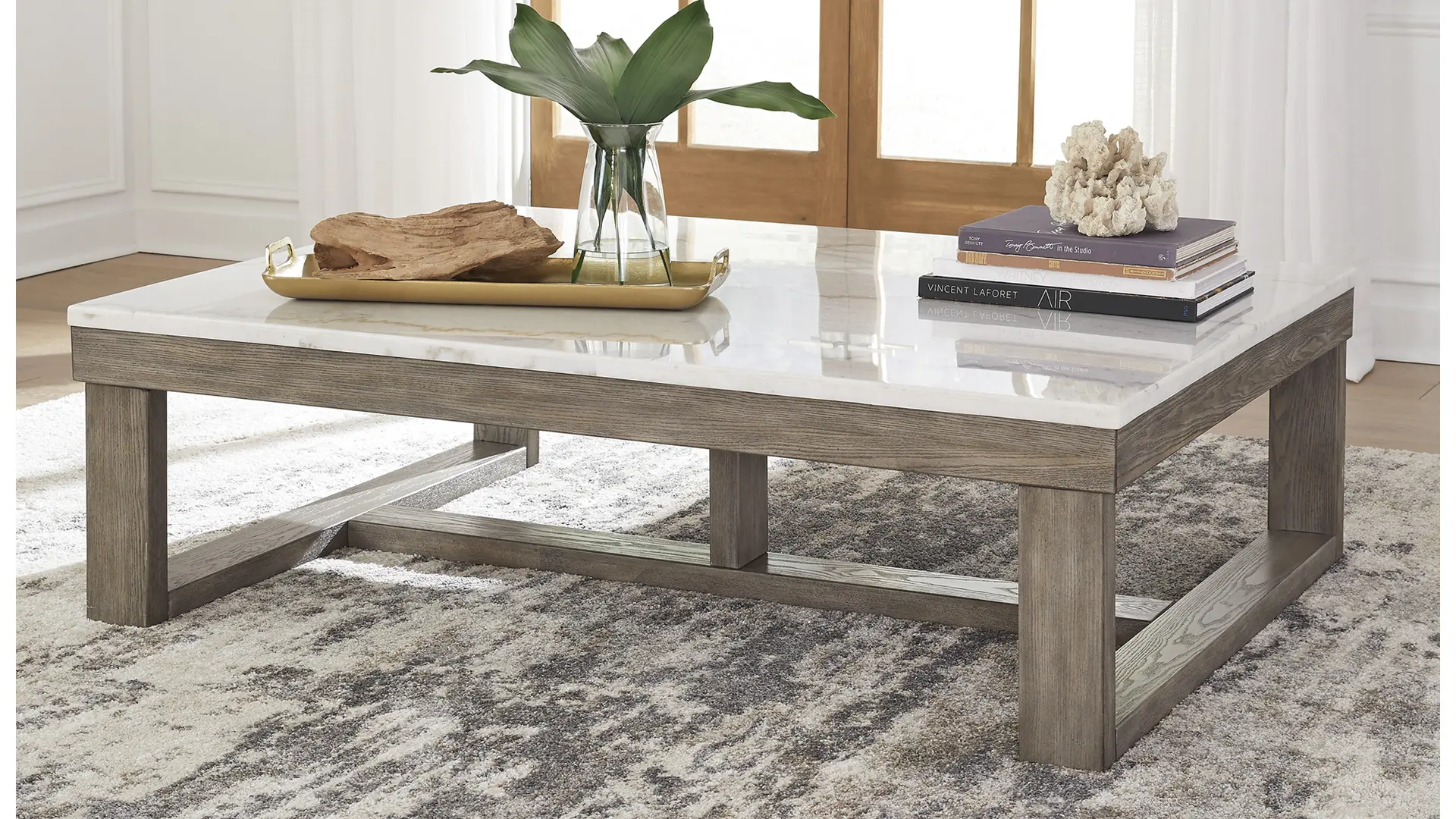 Welcome casual, contemporary style and functionality to your home. The Loyaska occasional table package, with natural white marble accents, delivers a mixed-material vibe. Finished in a grayish brown wood tone, this set lends a laid-back look that’s so welcome at the end of a long day.