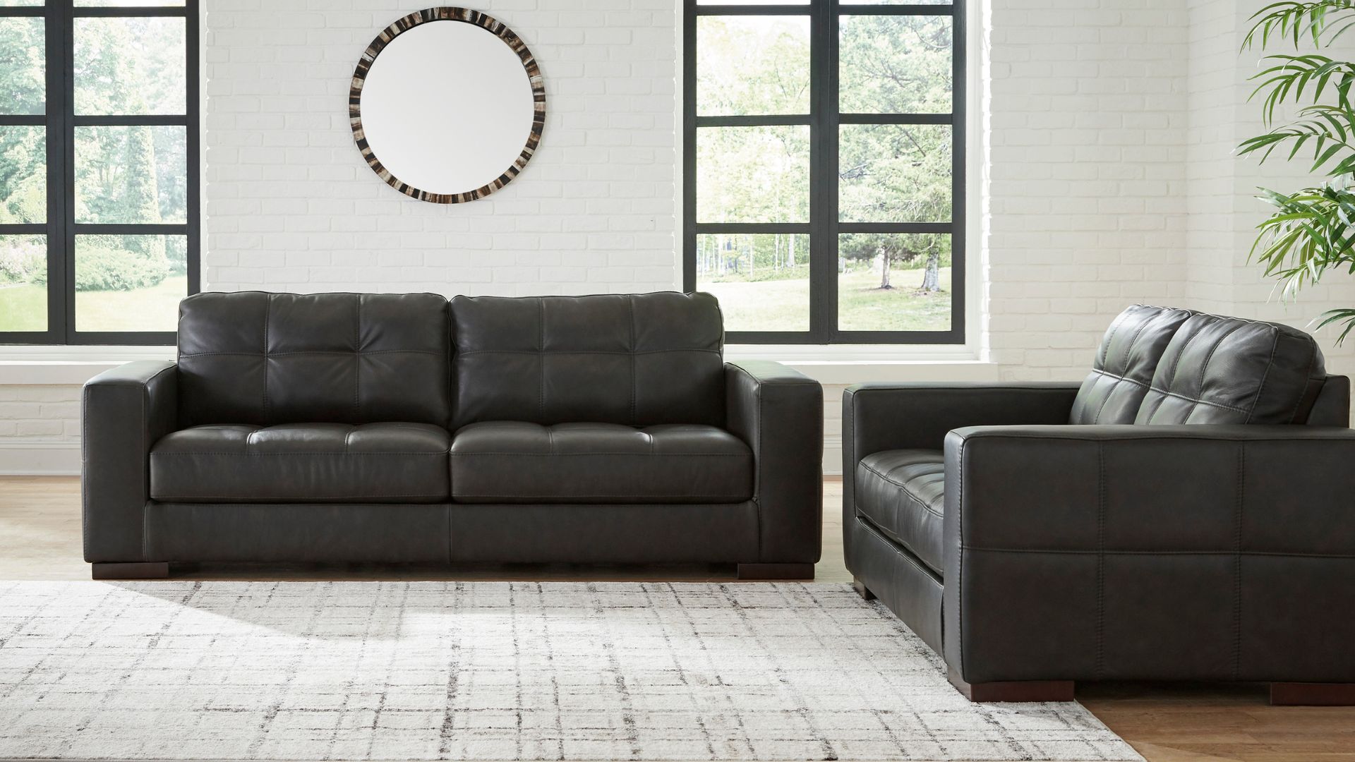 Casual and contemporary, this seating package suits those with a keen eye for everyday luxury. Its expertly matched leather and faux leather upholstery is filled with depth and dimension, incorporating an inviting sense of masculine character. With tufting details and linear silhouettes solidifying the set’s chill vibe, all that’s left to do is sit back and relax.