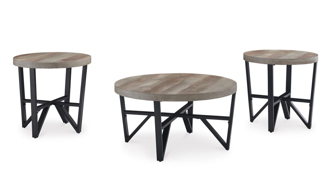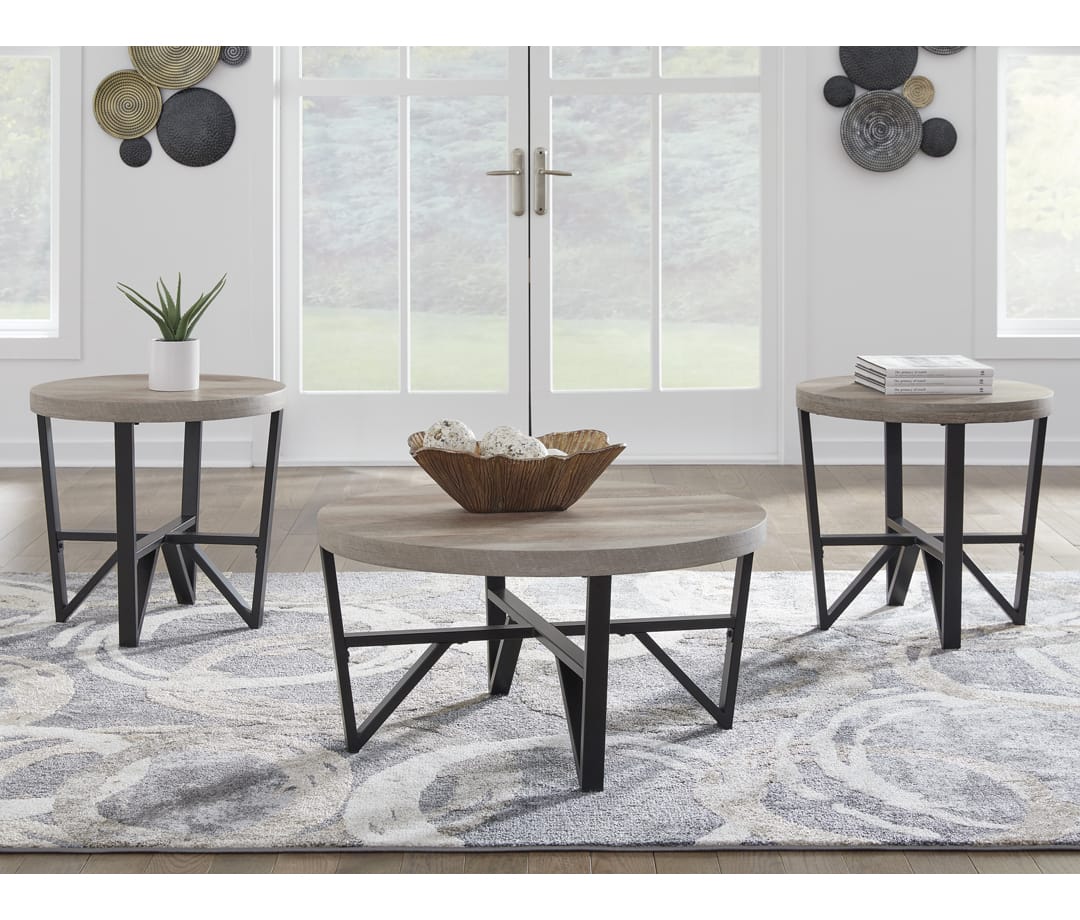 Stylish and versatile, the Deanlee table set brings a modern edge to any living space. The thick, round tabletops mimic the look of reclaimed wood with a light natural finish, creating a striking contrast against the sleek black metal frame. Designed for both form and function, these tables complement a range of interior styles, from urban chic to modern farmhouse.