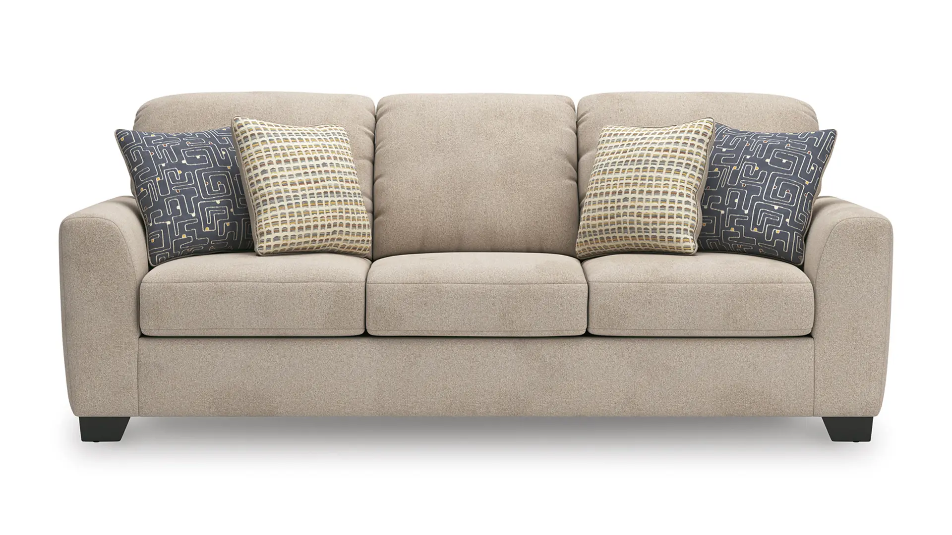Need a piece to perfectly anchor your home’s casual contemporary aesthetic? The pinnacle of chic comfort, the Panola sofa has a universal appeal thanks to plush chenille upholstery in a neutral hue. Its simple, streamlined design, with wide party arms, is sure to appeal to your relaxed approach to modern flair. Boldly patterned accent pillows complete the look. All that’s left for you to do is sprawl out solo or with friends and revel in the feeling of style made simple.