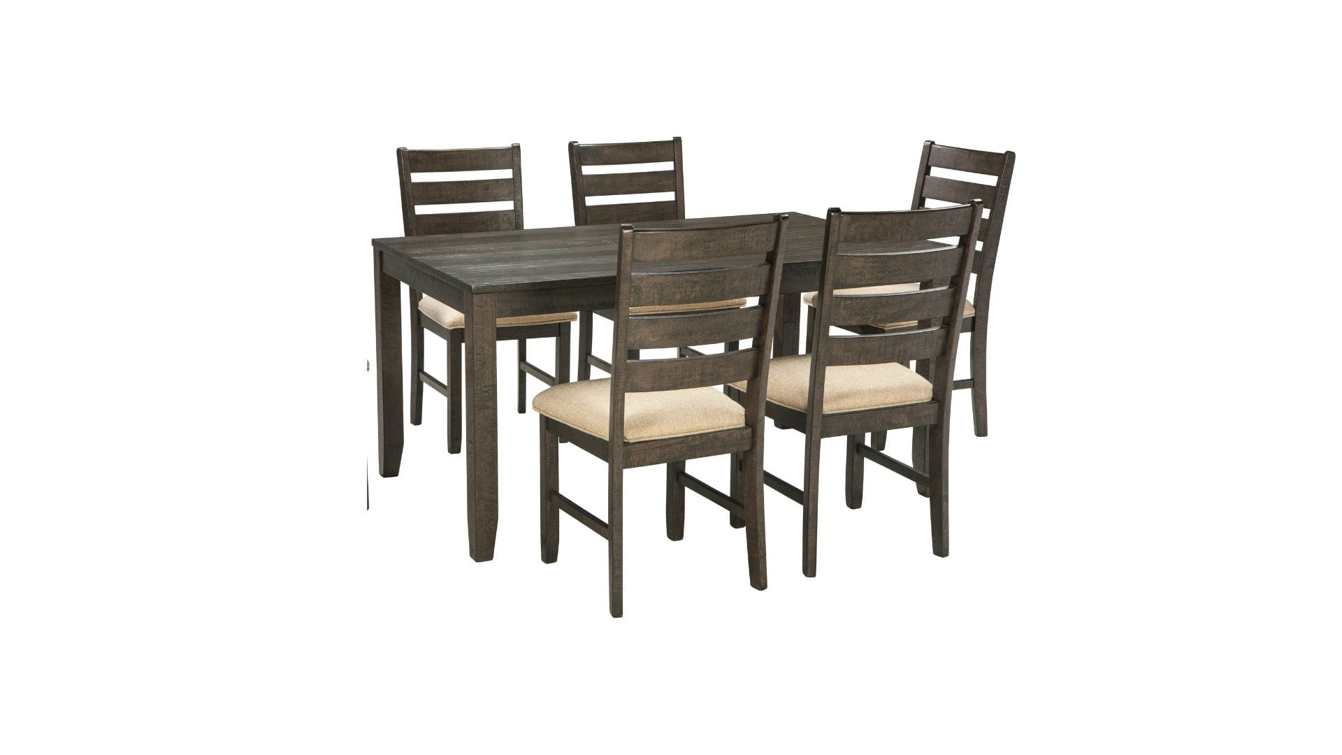 You love a clean and contemporary look—so long as it’s warm and inviting. With that in mind, the Rokane dining table set serves your sense of style beautifully. “Rough sawn” style finish with a hint of weathered charm tantalizes with a mood of relaxed elegance. Sumptuously upholstered seats in a neutral, textural fabric make the experience complete.