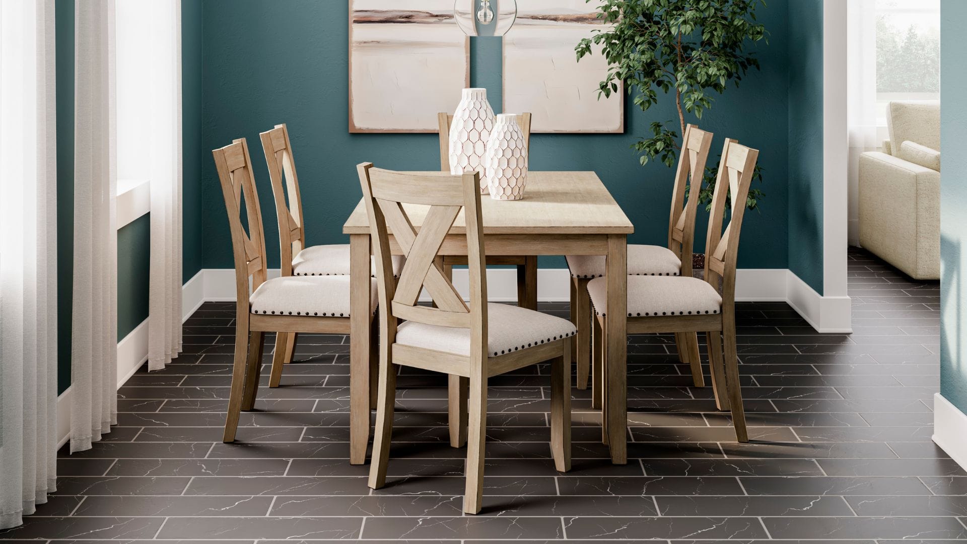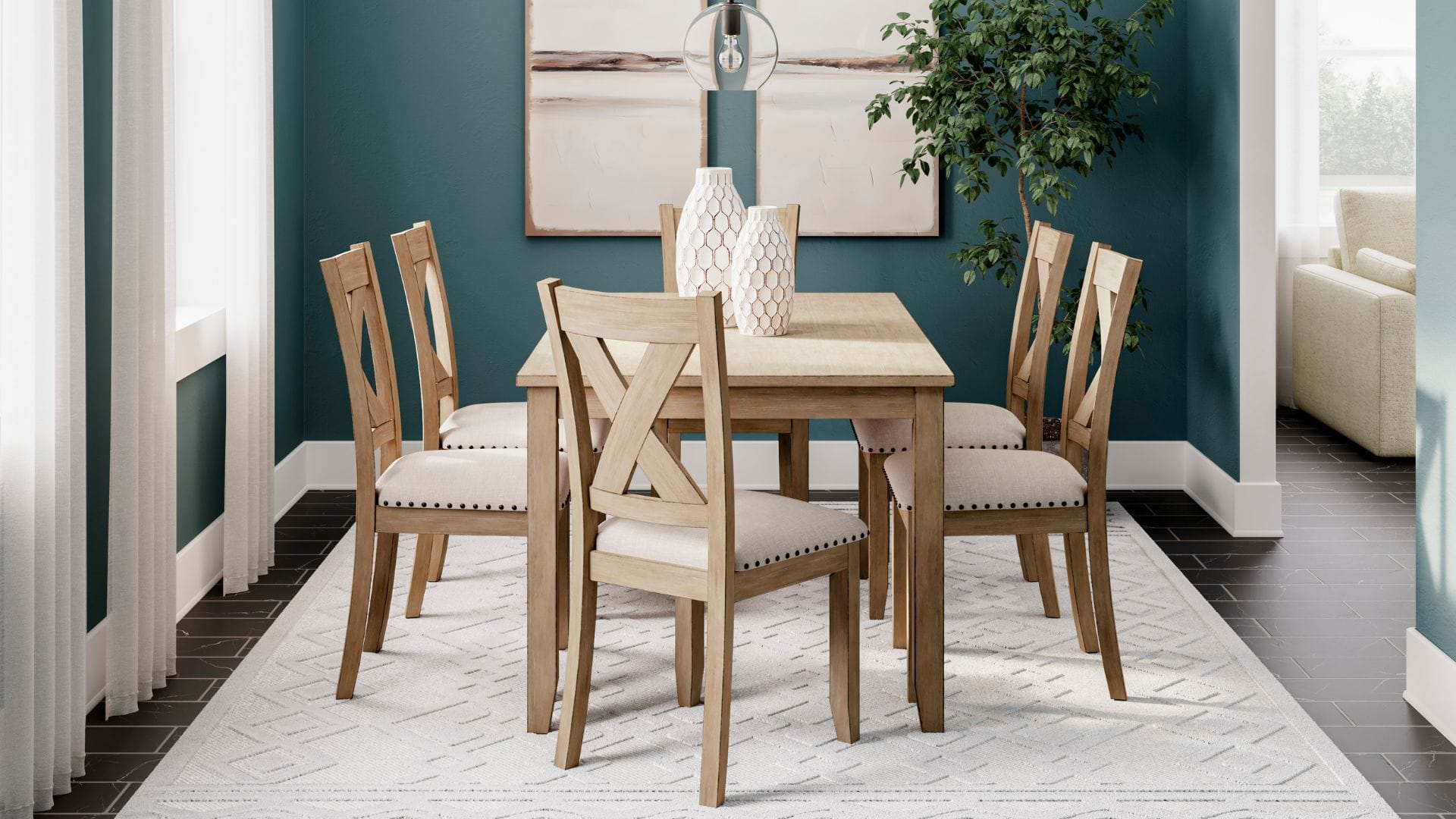 Show off your taste for charmingly curated style with the Sanbriar dining table set. Mastering modern farmhouse flair, the clean-lined design sports neutral seats punctuated by nailhead trim. A light, natural finish inspires delightfully carefree dining.