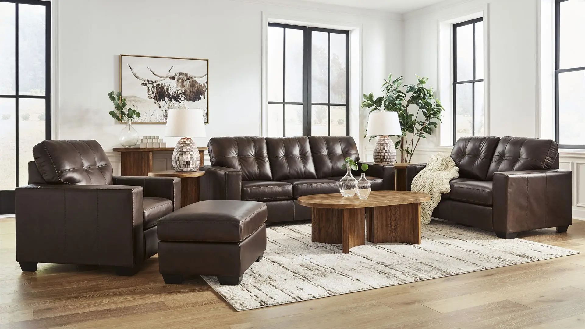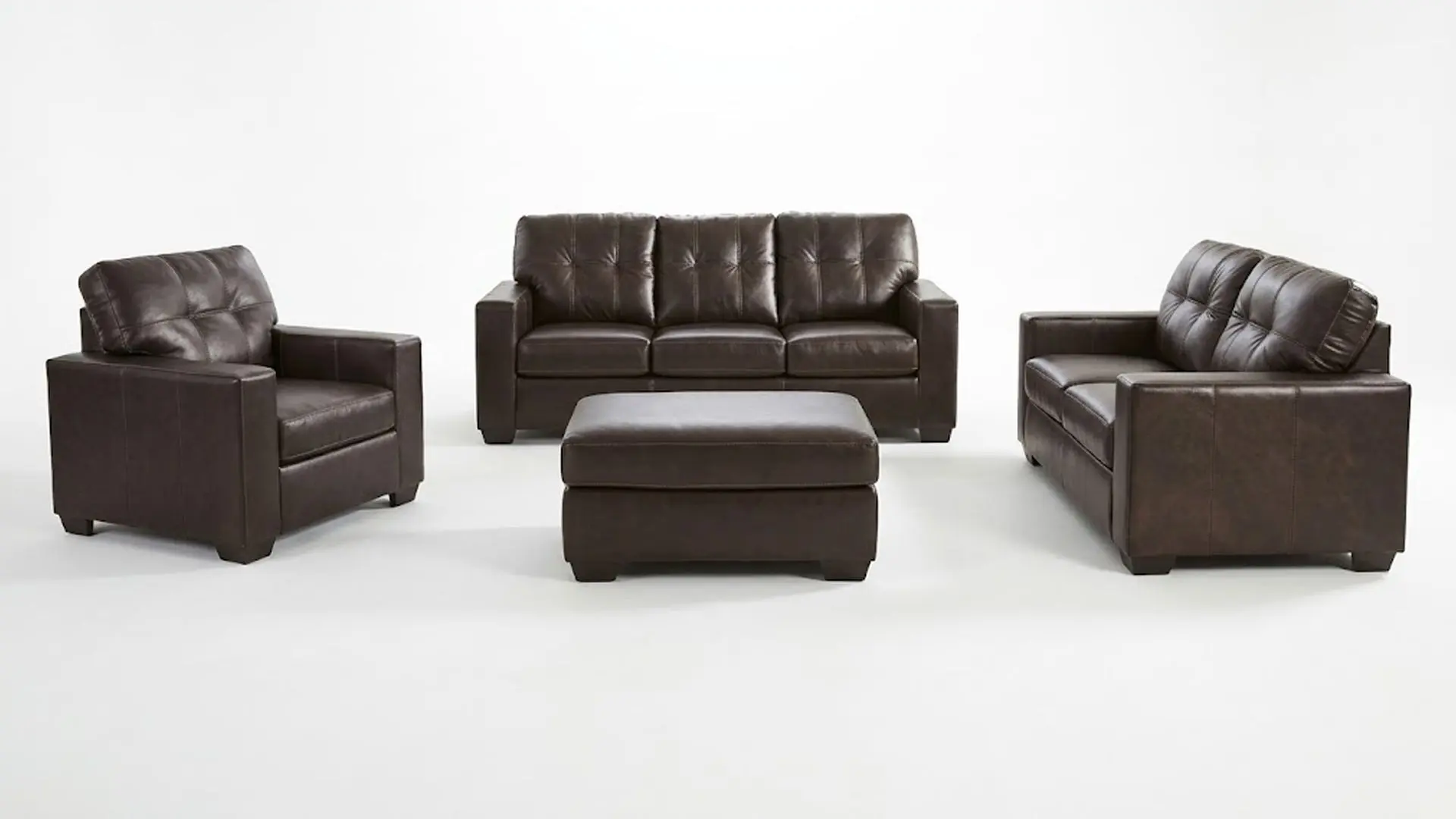 Whether your inspiration is contemporary or classic, the Santorine sofa’s good looks and affordable luxury are hard to deny. Its clean-lined silhouette and skillfully matched leather and faux leather upholstery offer a transitional sensibility that’s right at home in your home. And the ample cushions with tufted details invite you to relax in comfort.