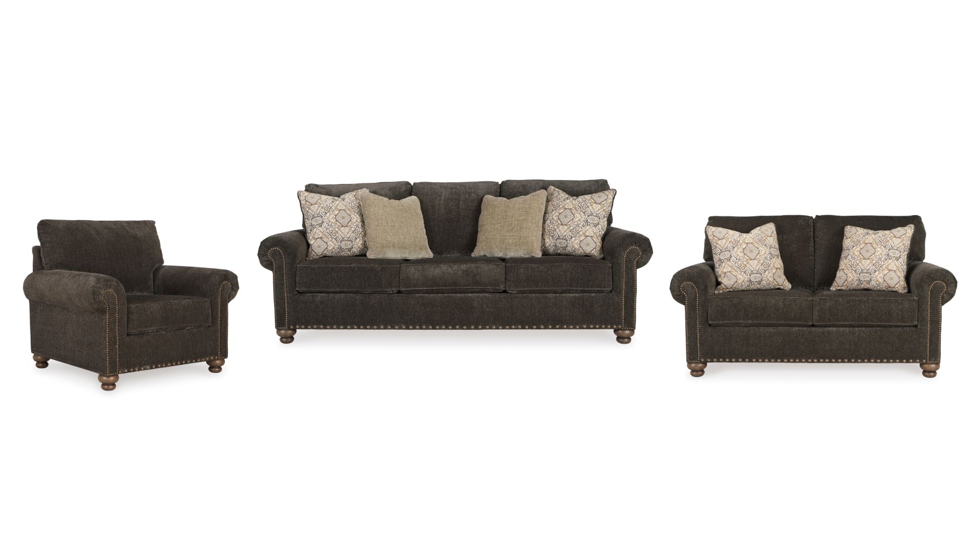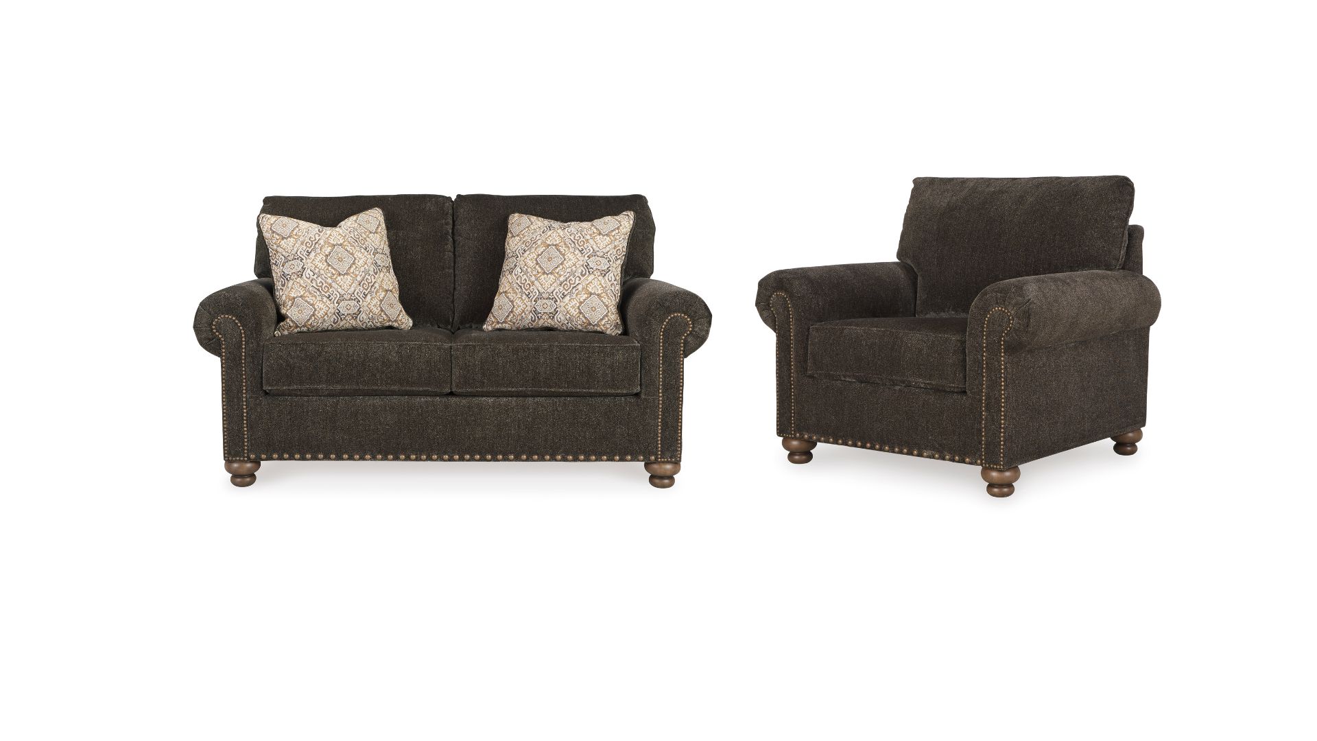 Everyone can have the best seat in the house with the Stracelen sofa and loveseat set. Nailhead trim puts the finishing touches on the traditional roll arms you love. Reversible seat cushions with high-pile chenille fabric keep your sofa feeling plush. Textured velvet and European-influenced jacquard pillows add another layer of comfort. Turned feet in a burnished light brown finish show that style and quality flow from top to bottom.