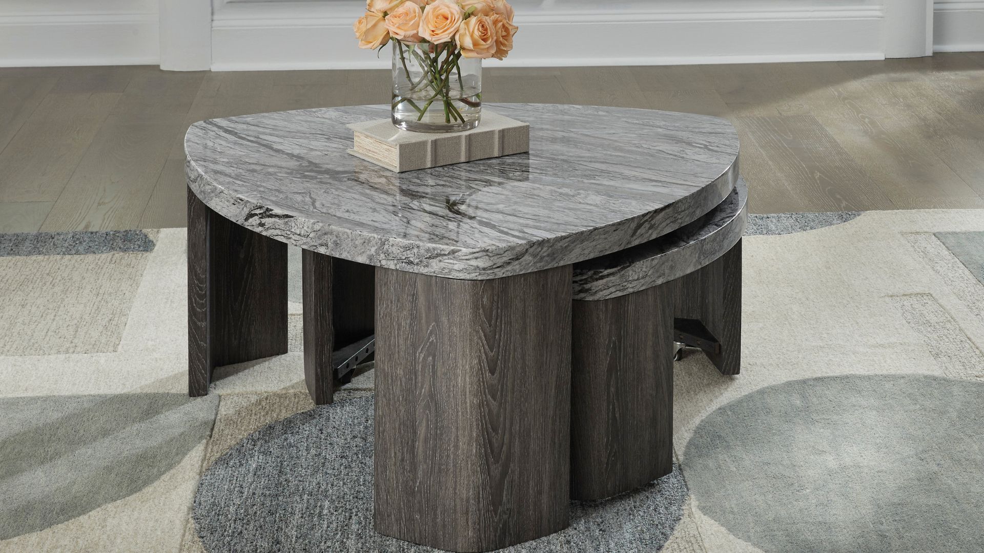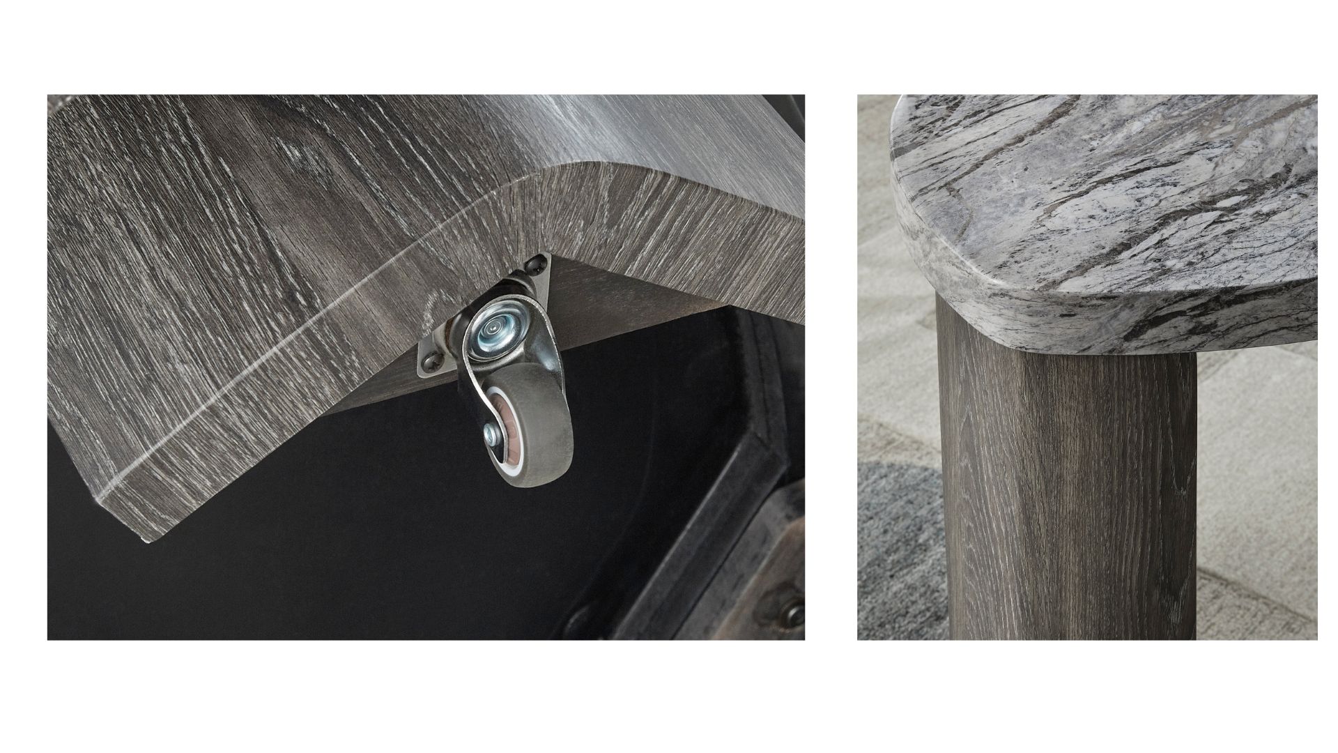 Striking contemporary form, meet can’t-miss function. The Surmour stacked coffee table pairs the look of faux gray marble with a weathered gray wood grain for a simply chic approach to monochromatic style. Make the most of your space with its cantilevered design—simply roll out the pivoting lower table when you need the extra room, and effortlessly tuck it away when you don’t. What a luxe take on everyday living.
