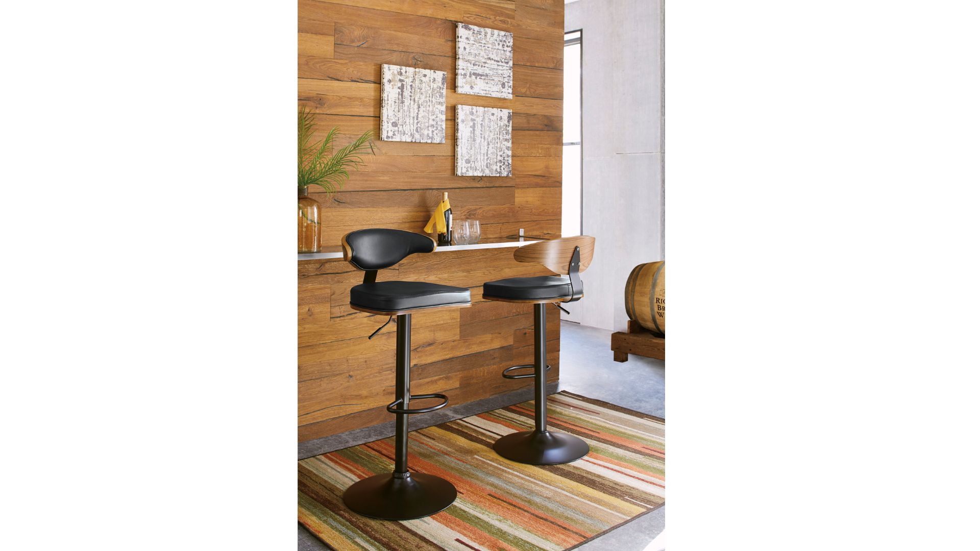 Style takes quite a modern turn. Sporting a distinctively contoured back, this upholstered swivel bar stool is sure to bring an elevated look to your living space. Wrapped in a black faux leather upholstery, the seating area’s artful contours put the accent on comfort.