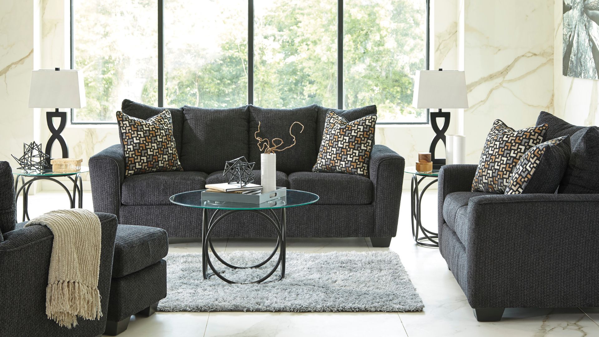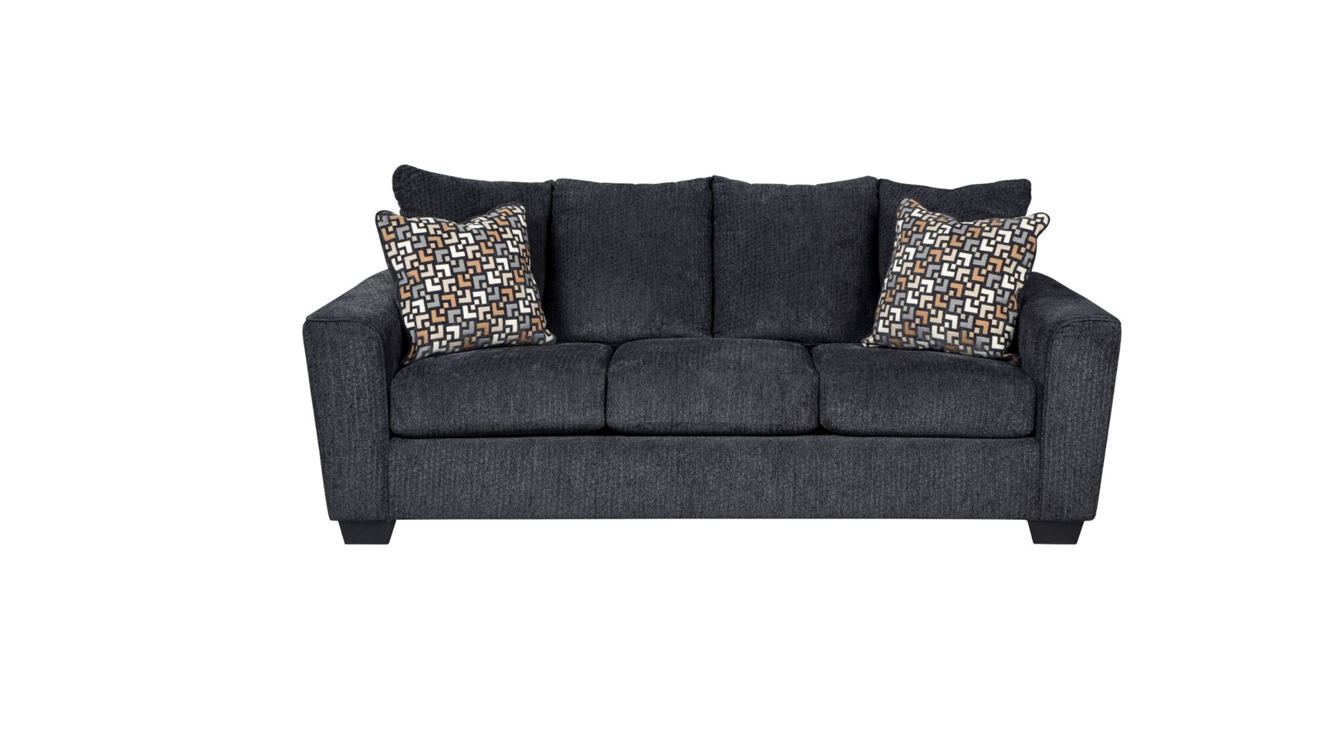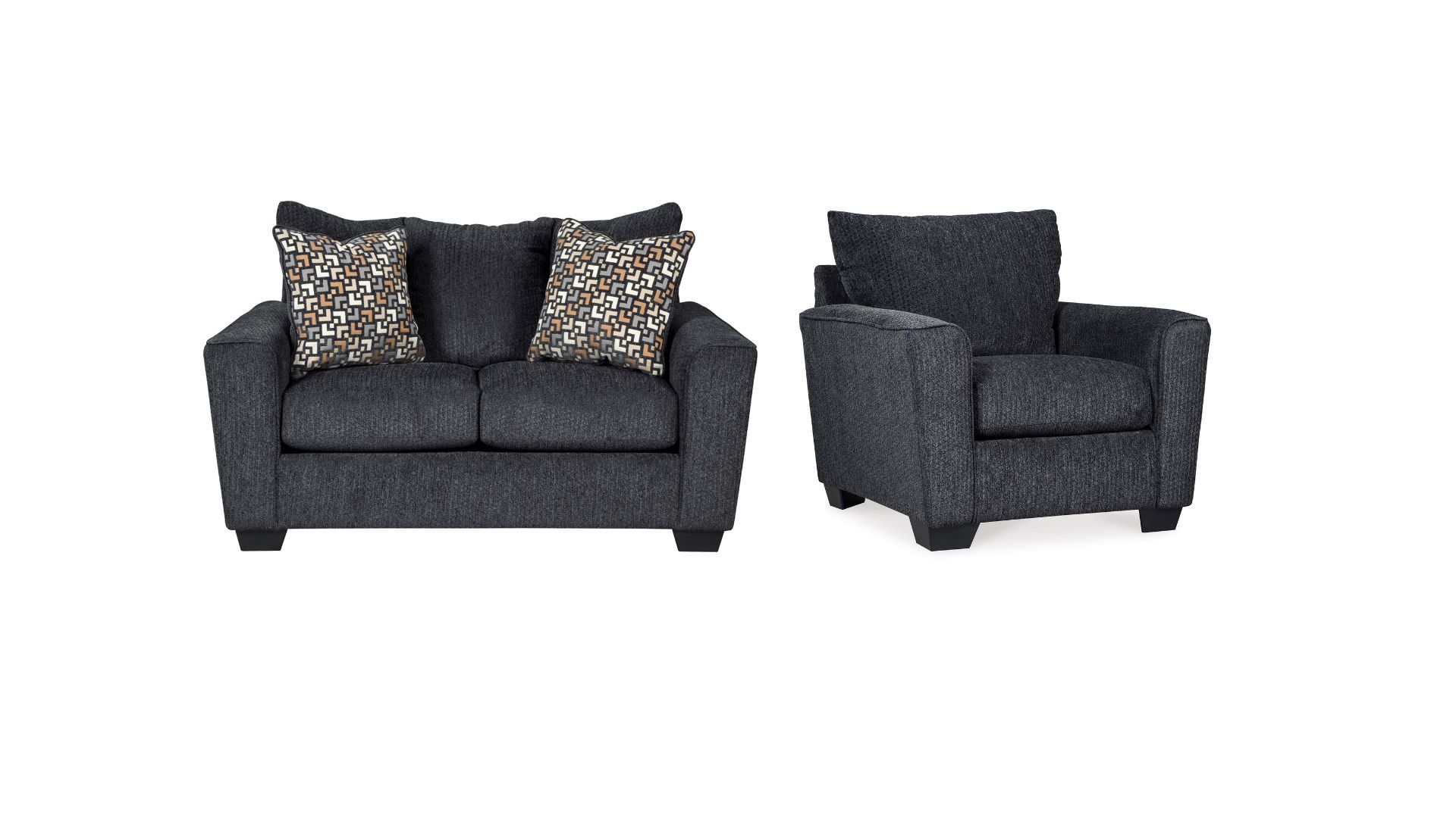 With the plush pillow back and supportive seating cushions all surrounded in a soft upholstery fabric, the Wixon-Slate upholstery collection takes comfort to the next level. The beautiful contemporary design of the stylishly shaped arms and dark finish tapered feet give this furniture a look that is sure to enhance the dcor of any living area.